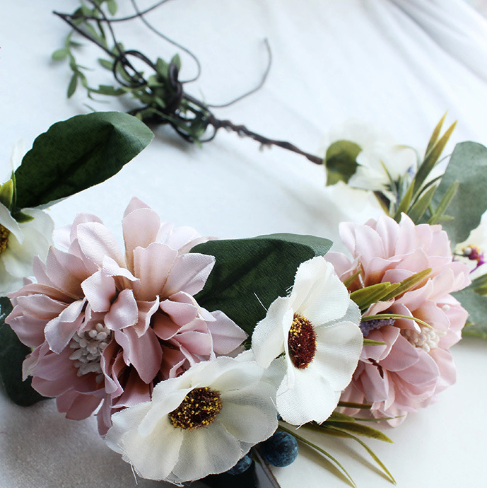 Sød krans med to større sarte lyserøde blomster og blålige bær.