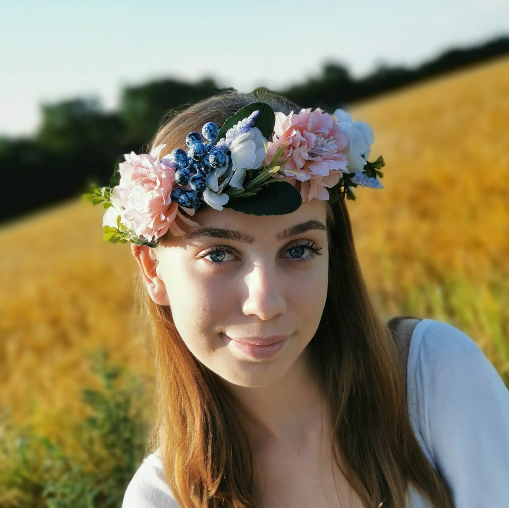 Så fin og eventyrlig en krans. Den bindes i nakken og du kan lade de fine flettede tråde med blade løbe ned igennem håret.