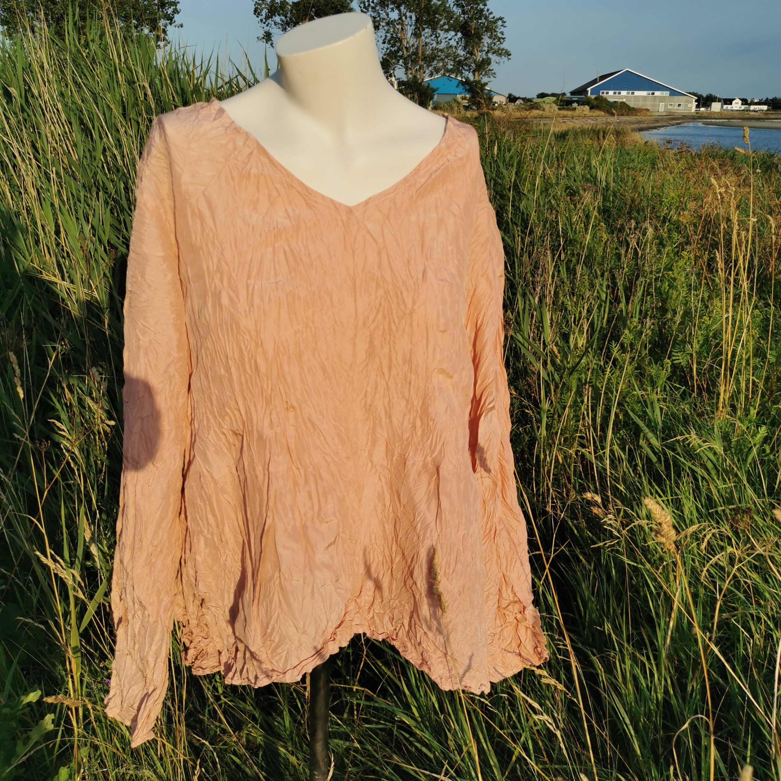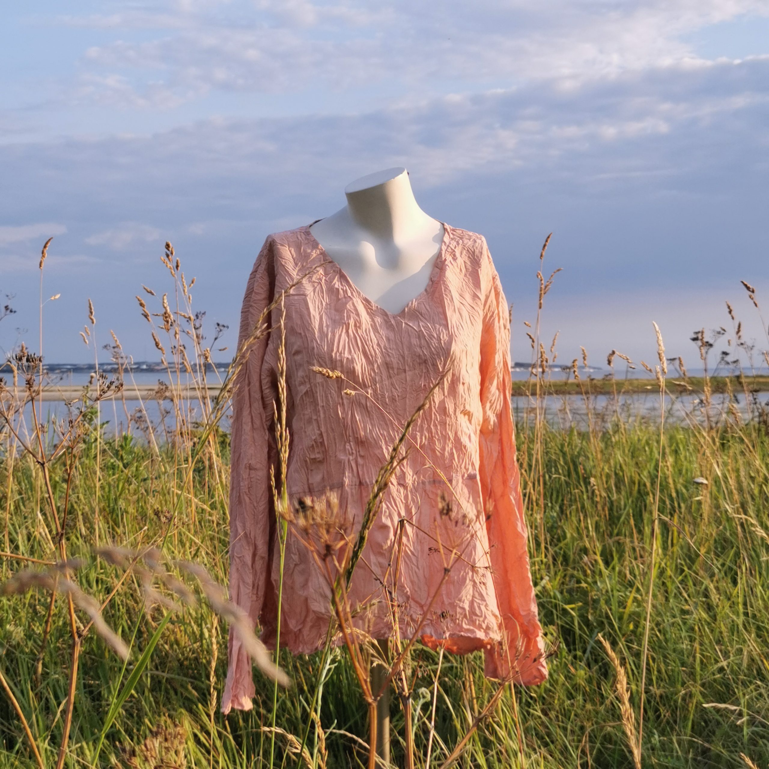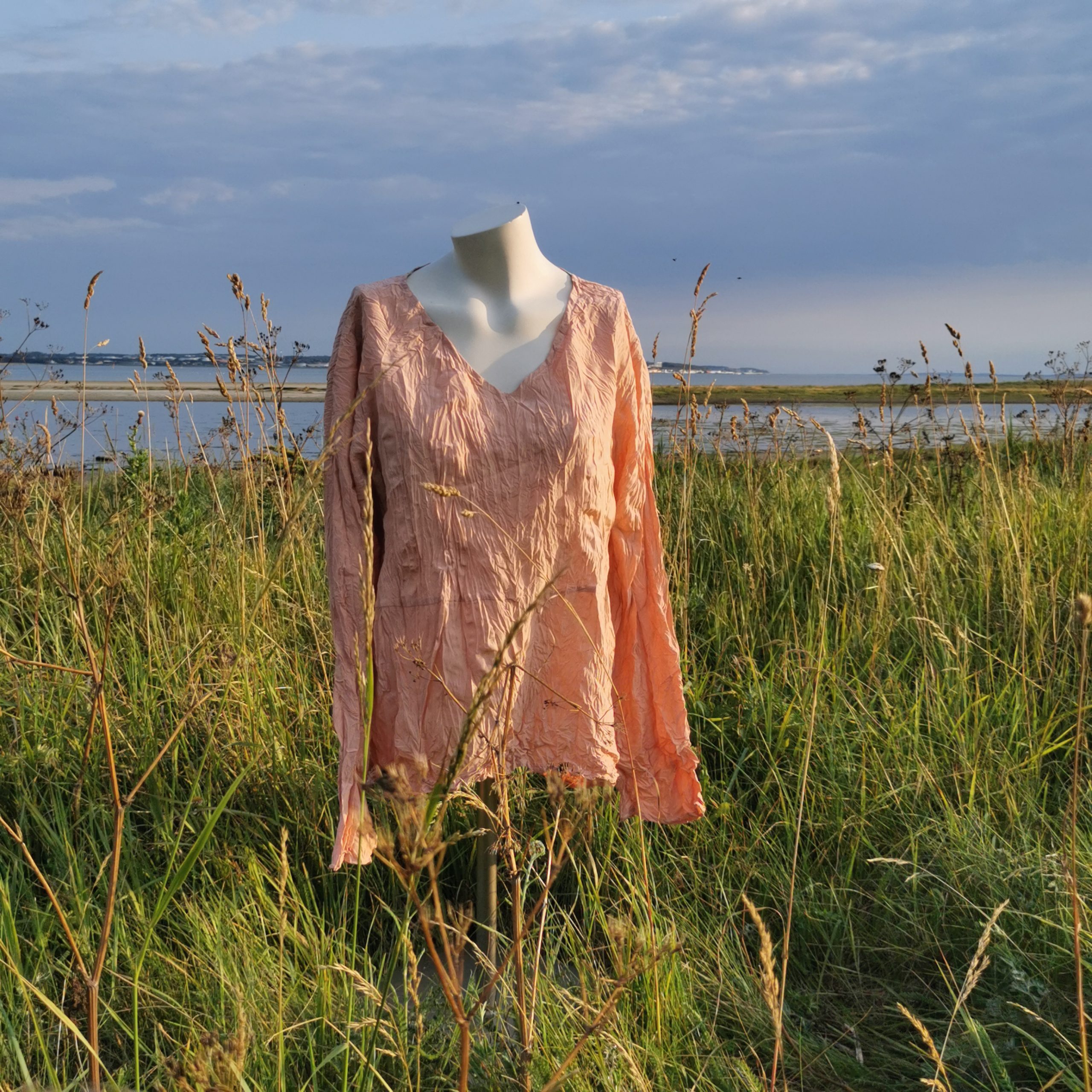 En krøllet silkebluse der er ud over det sædvanlige. Blusen er indfarvet i hånden med plantefarve, hvilket giver et helt særligt farvespil og dybde i farverne og som samtidig gør den unik. Blusen emmer af poesi og har på samme tid et afslappet og eksklusivt look. Blusen er syet på en lille systue i Danmark og modellen har en flatterende pasform. Du vælger selv om du ønsker det krøllede udseende eller en mere stilren bluse. Ved vask retter krøllerne sig ud og du kan vælge at krølle blusen igen eller bære den som glat. I sidstnævnte tilfælde kan du stryge blusen ved svag varme, mens den endnu er fugtig. På den måde får du i realiteten to bluser i en bluse.