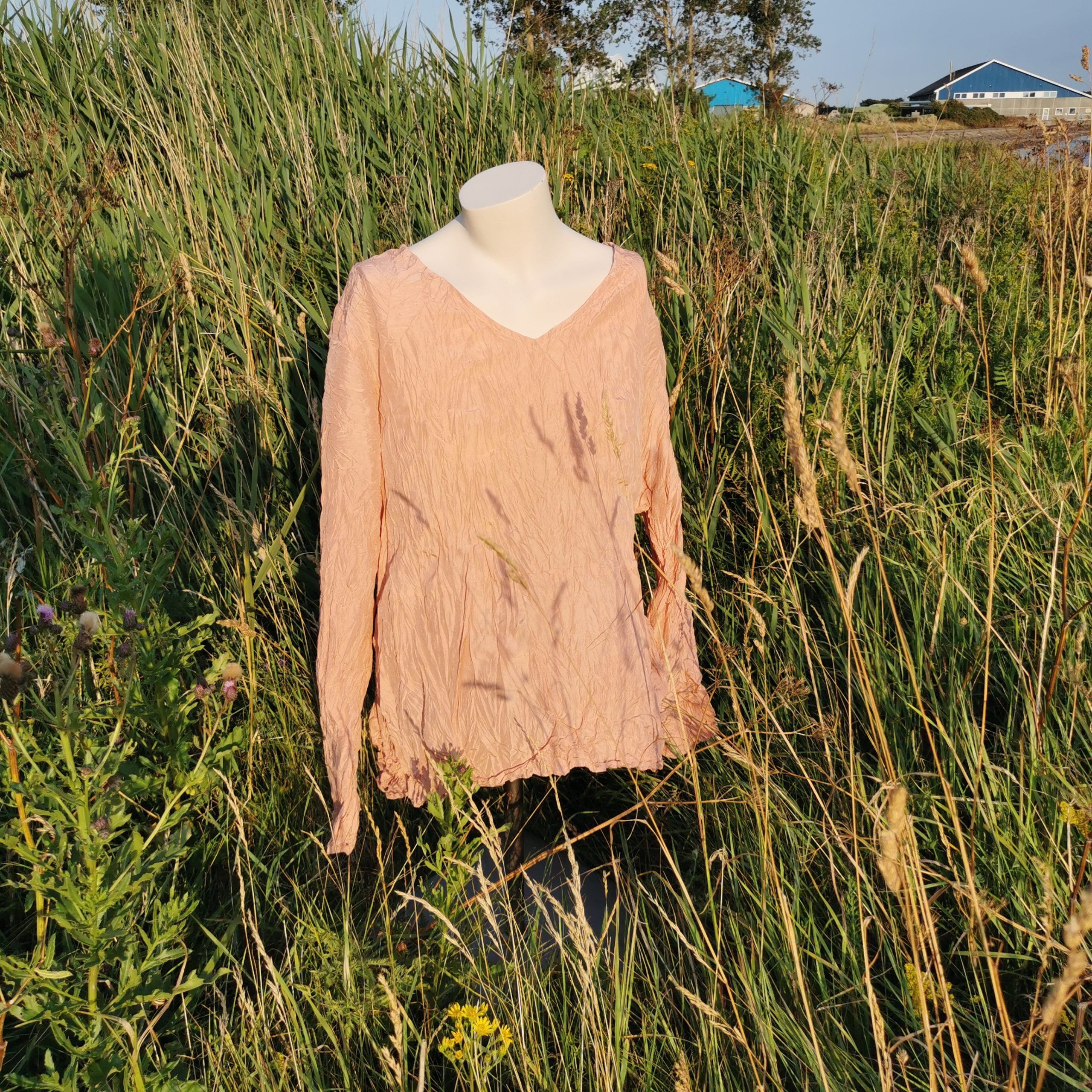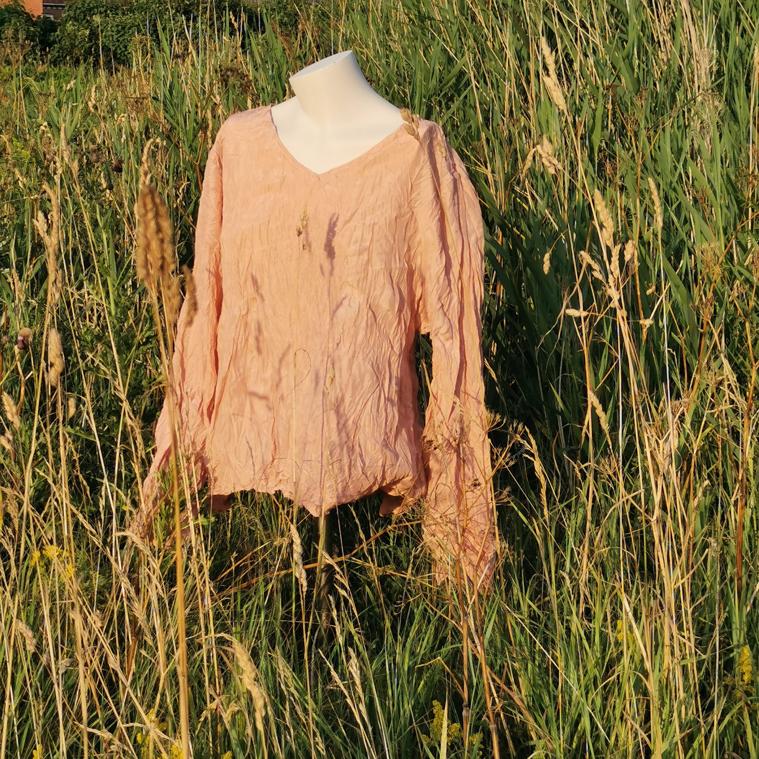 Denne bluse er en ud af en lille serie af planteindfarvede bluser i 100% silke som mærket Open Nordic Sky står bag. Langt størstedelen af de planter der bruges i indfarvningsprocessen dyrkes lokalt og arbejdet starter almindeligvis med såning af frø. Det er indbegrebet af slow fashion – et udtryk som i dag bruges i flæng fordi det har positive associationer. Bluserne indfarves løbende efterhånden som de sælges, således at der ikke opstår et unødigt spild.
