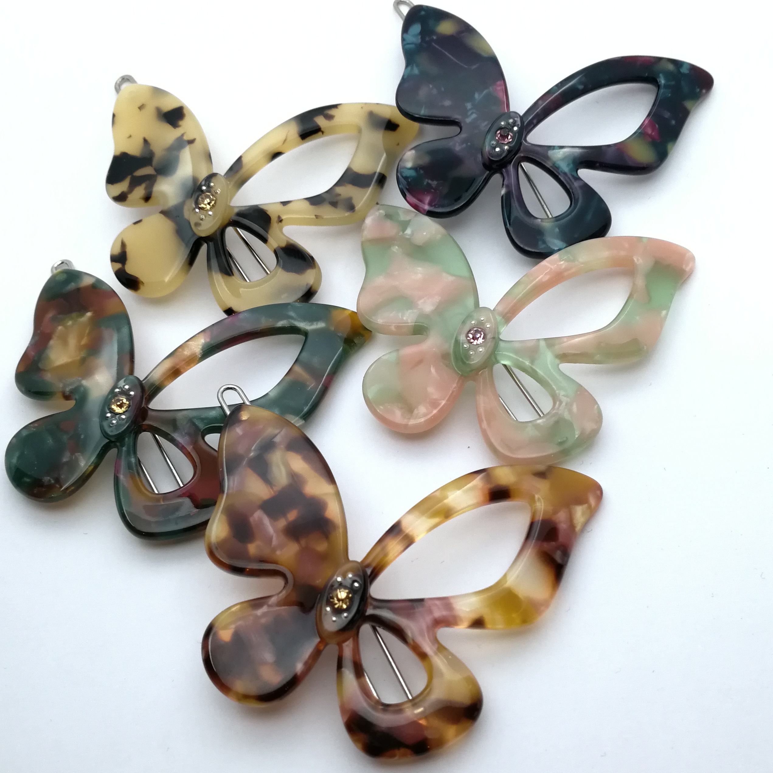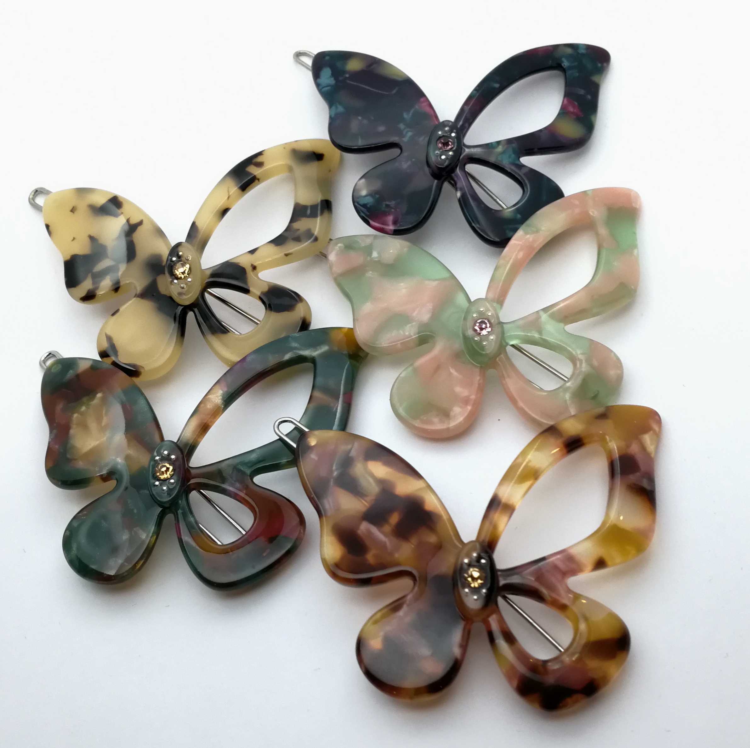 Sommerfulgespænde med tryklås i højglanspoleret cellulose acetate. Spændet findes i fem grundfarver, som alle er kendetegnet ved at de changerer. Farverne er indlejret i materialet og der er derfor ingen risiko for at de med tiden slides af. For at sikre et godt greb har sommerfuglene små gummiriller på undersiden. I midten har sommerfulglen små pyntesten, som glitrer smukt. Et super feminint og romantisk hårspænde som kan bruges af såvel små som store piger.