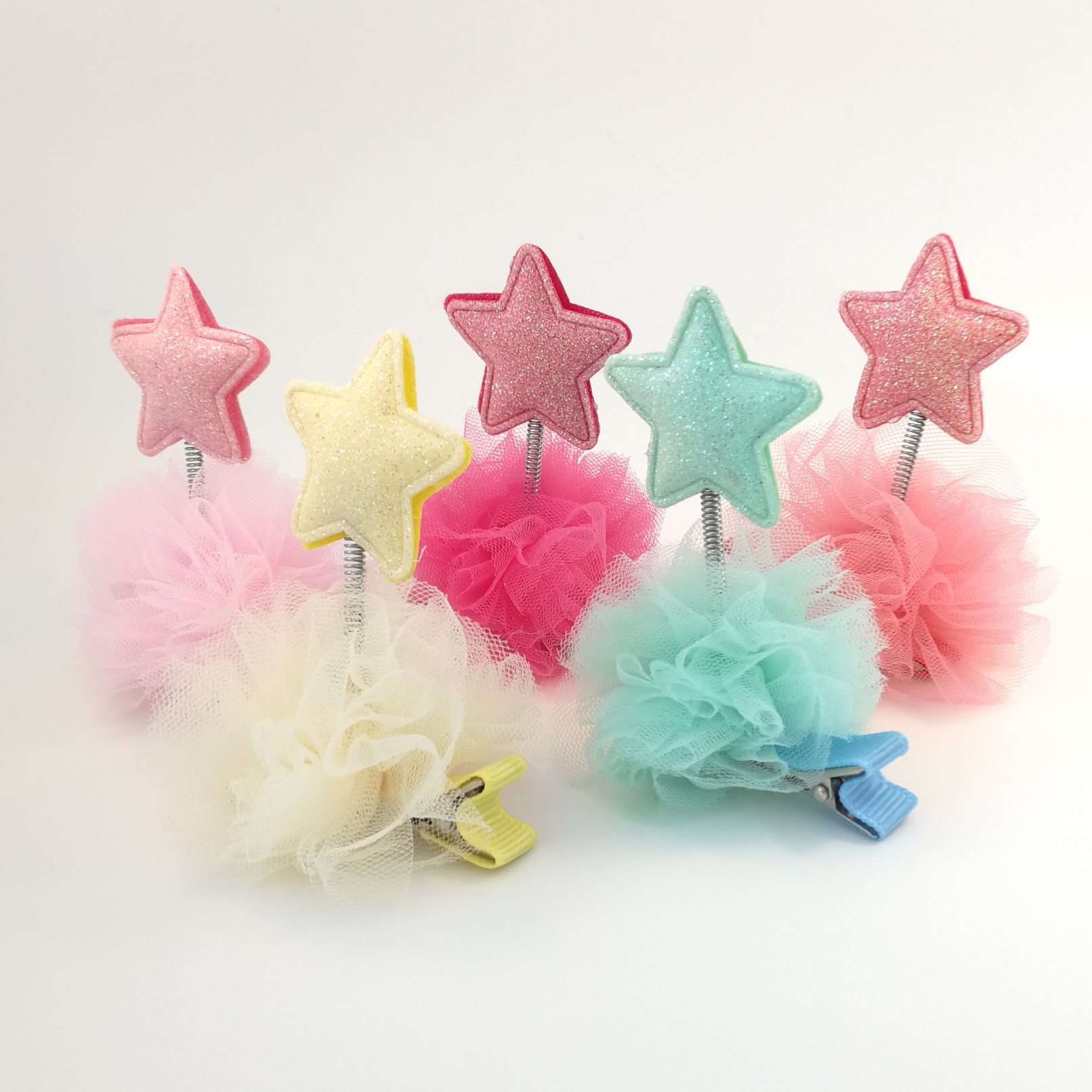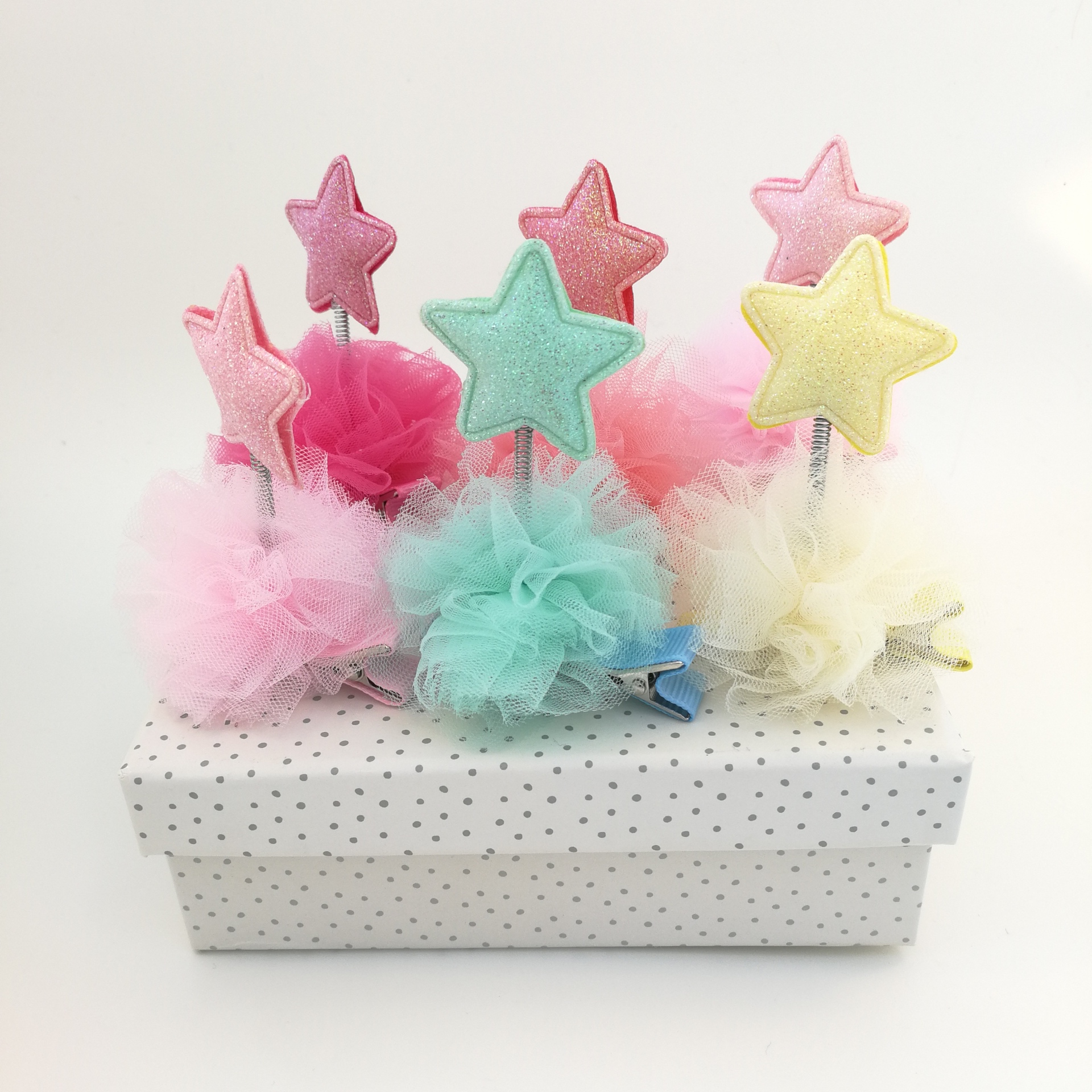 Tutter hårklemmer er navnet på de sødeste og fineste klemmer der er perfekte til at holde en tot pandehår på plads eller til at pynte på siden af hovedet. Stjernen er fastgjort på en lille spiral som er monteret ned i tyl pompomen. Det hele sidder på et stofbeklædt metalklemme. Den perfekte gaveidé til en pigefødselsdagsfest.