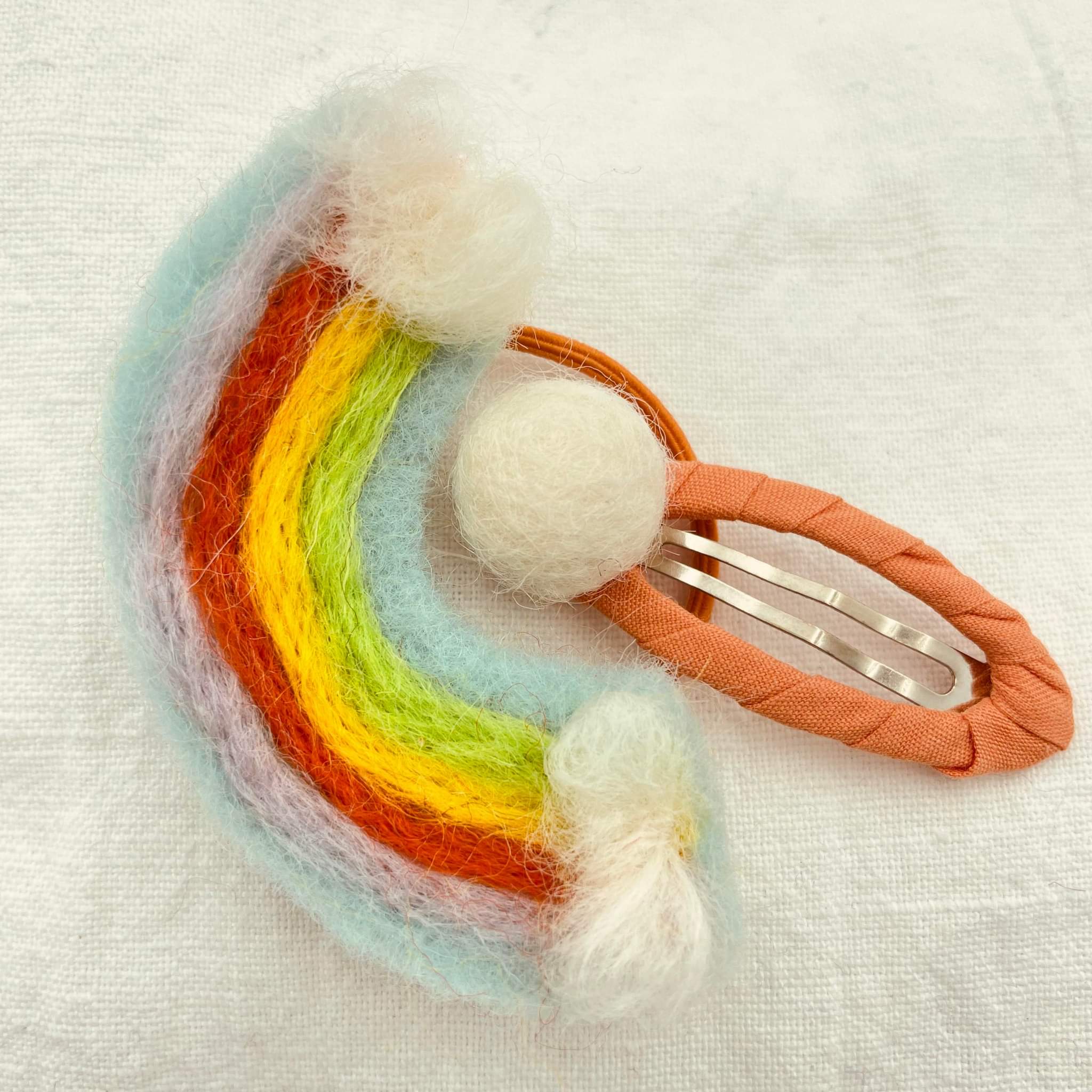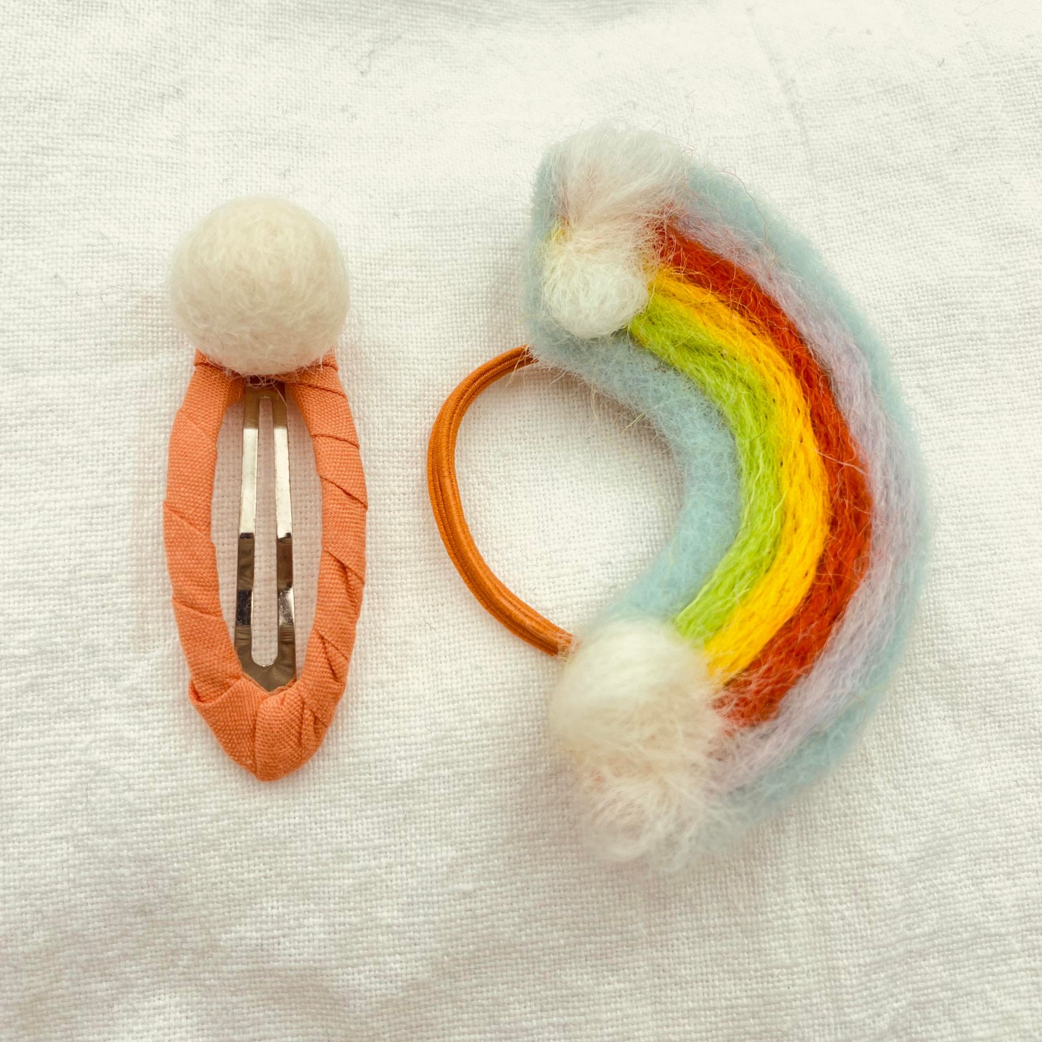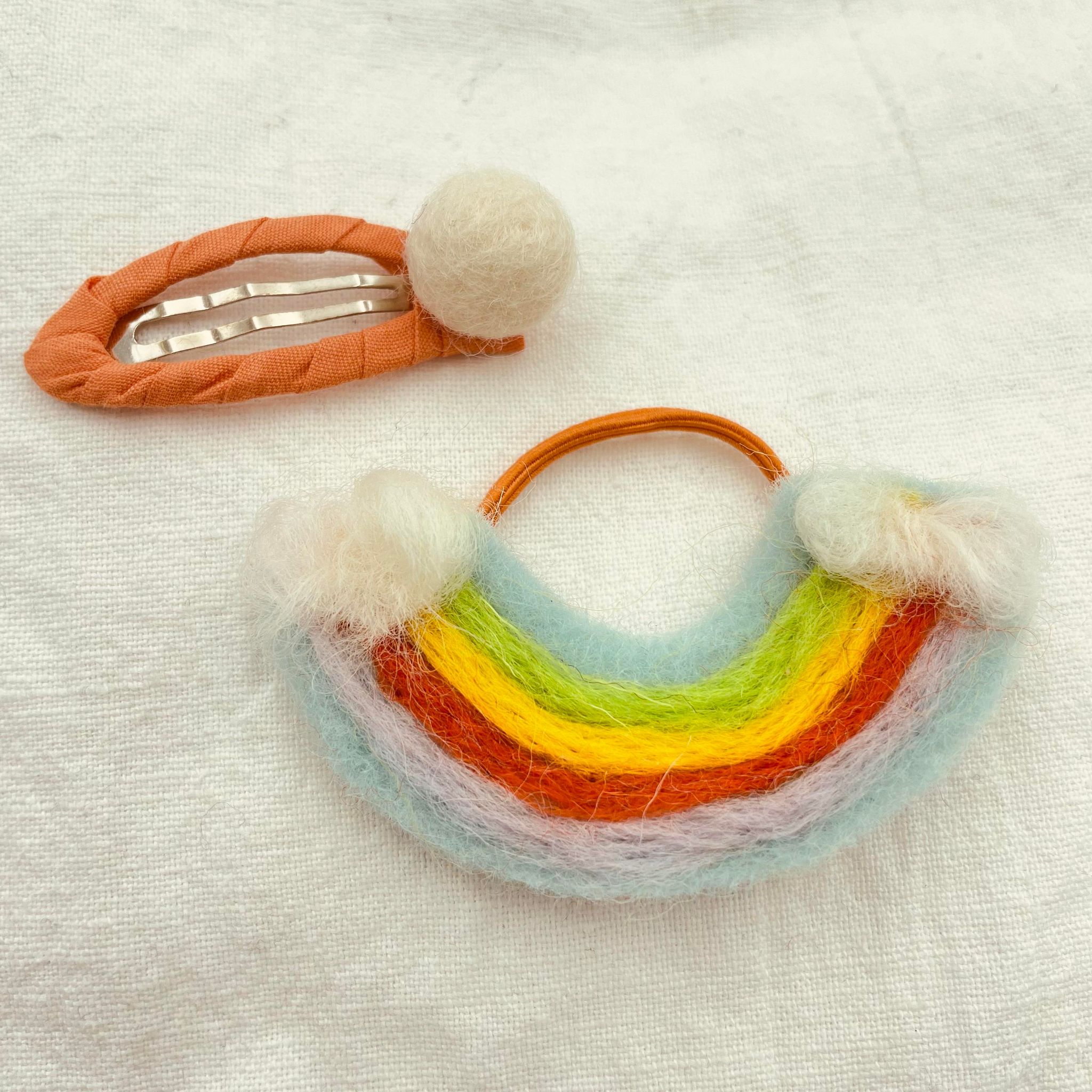 Den sødeste hårelastik og det sødeste klikspænde i model regnbue. Der er tale om et super fint håndlavet hårpyntesæt i filtet uld, som adskiller sig fra det man normalt ser. Hos Tøseriet er vi rigtig glade for regnbuer, både fordi de er smukke og fordi de for os er et symbol på den verden som vi ønsker, hvor mangfoldighed er et af nøgleordene. Giv sættet som en fødselsdagsgave, til bedsteveninden som en overraskelse, eller blot fordi du har lyst til at give en lille gave til en som står dig nær. Det er givetvis masser af anledninger og nogle gange skaber det den største glæde når en gave gives uventet og måske endda helt uden grund, men bare fordi.