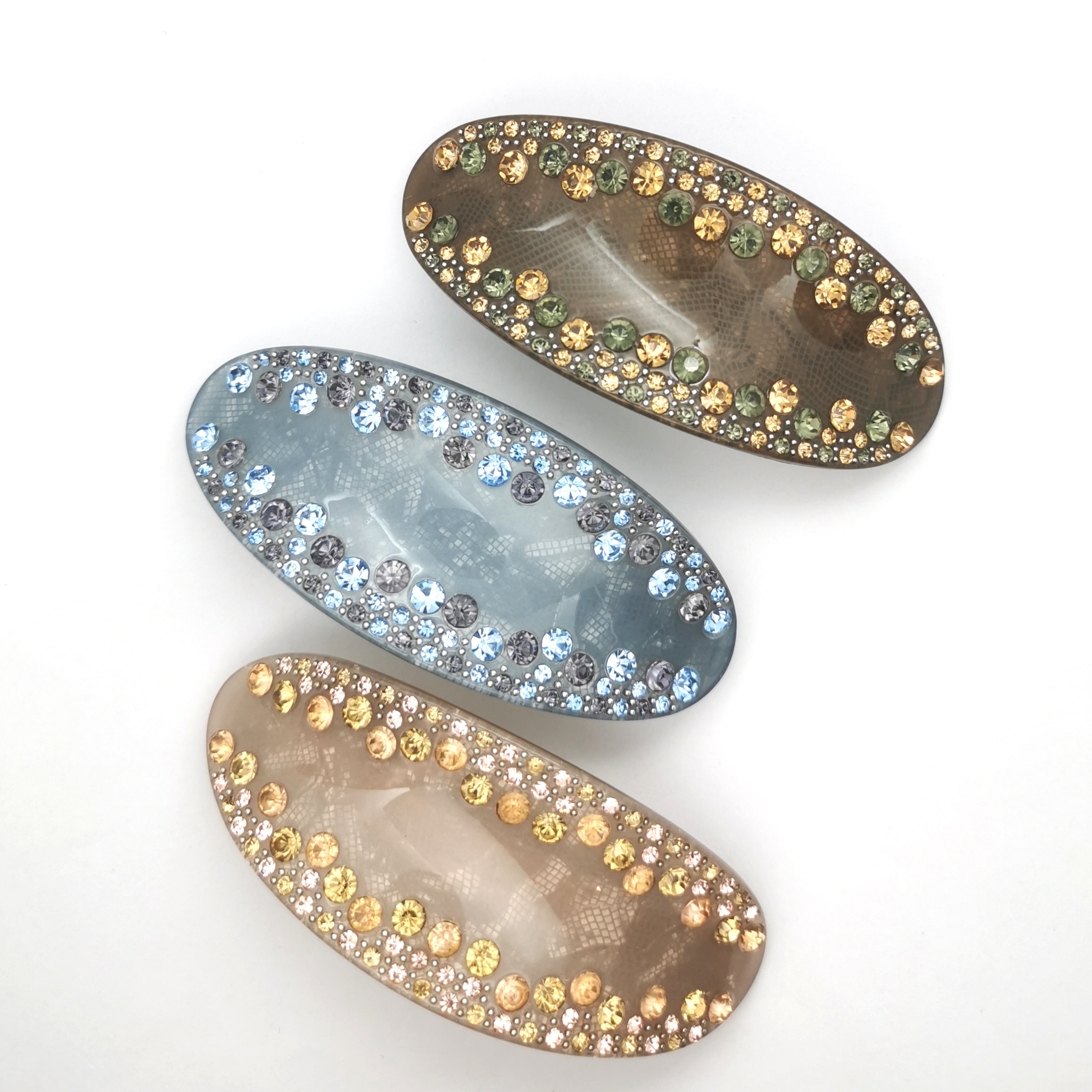 Dette spænde er fyldt med gliterende sten hele vejen rundt i kanten. Så enkelt og smukt. På selve spændelåsen er monteret et gummibånd som dels sikrer at spændet får et godt greb i håret og desuden at det er skånsom for håret.