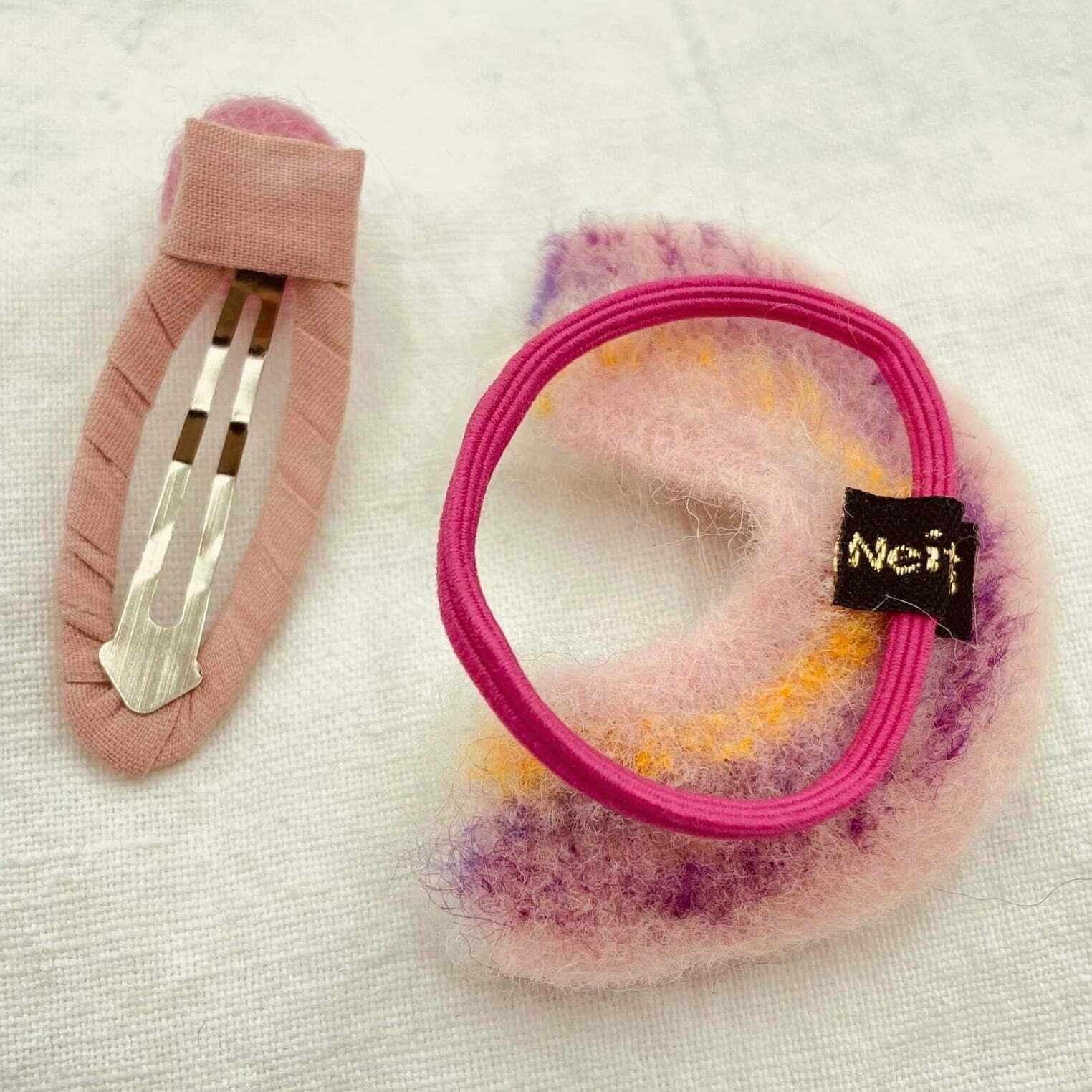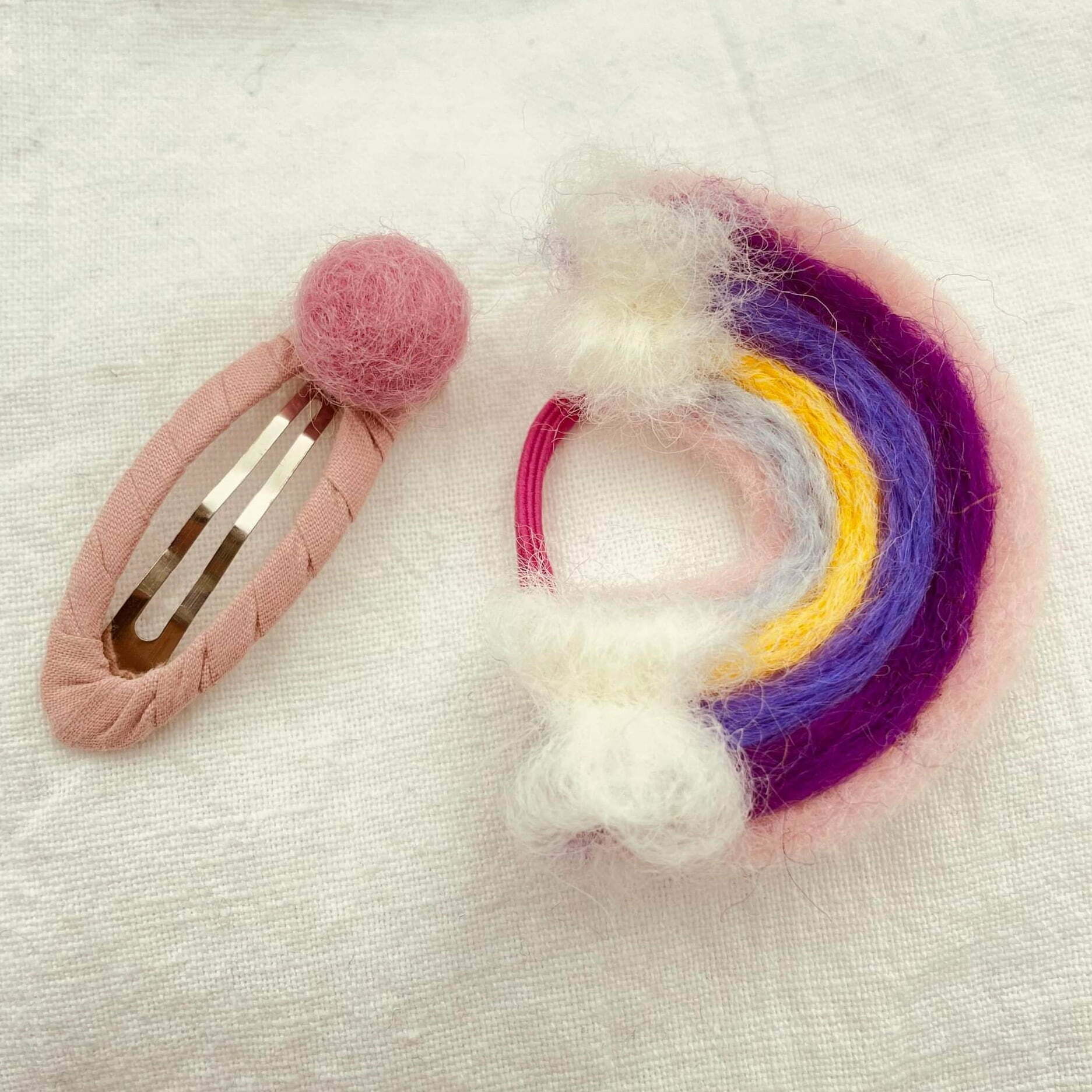 Sættet – regnbue hårelastik og klikspænde – findes også i en udgave hvor grundfarven er blå. Begge udgaver er charmerende og sender positiv vibes afsted. Vil du med på den rejse?