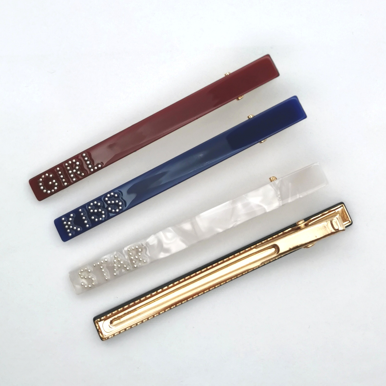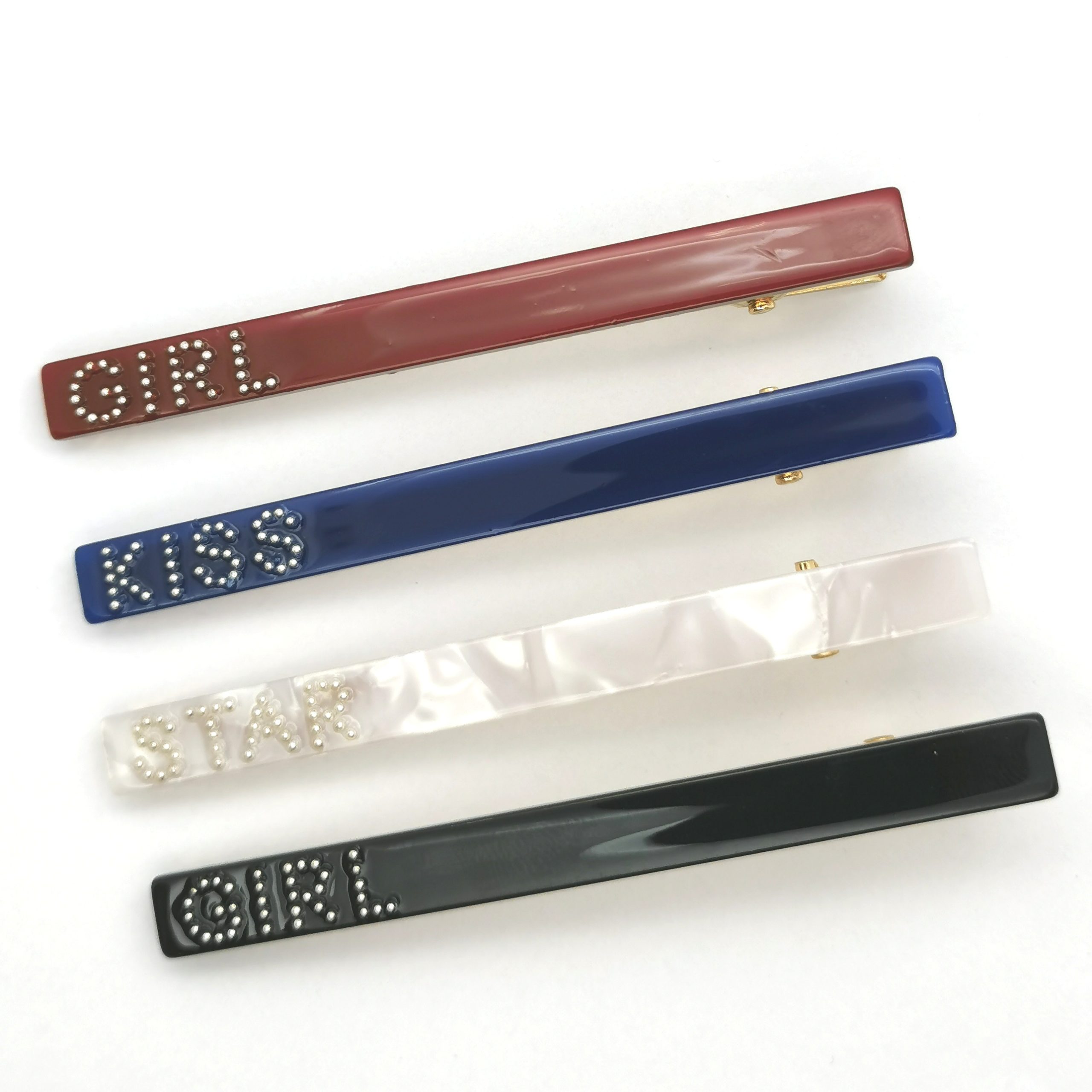 Hvilken historie har du lyst til at fortælle dine omgivelser? Vælg det hårspænde der passer til dit humør. De findes i fire farver: Sort eller rødt med teksten Girl. Blåt med teksten Kiss og hvidt med teksten star.