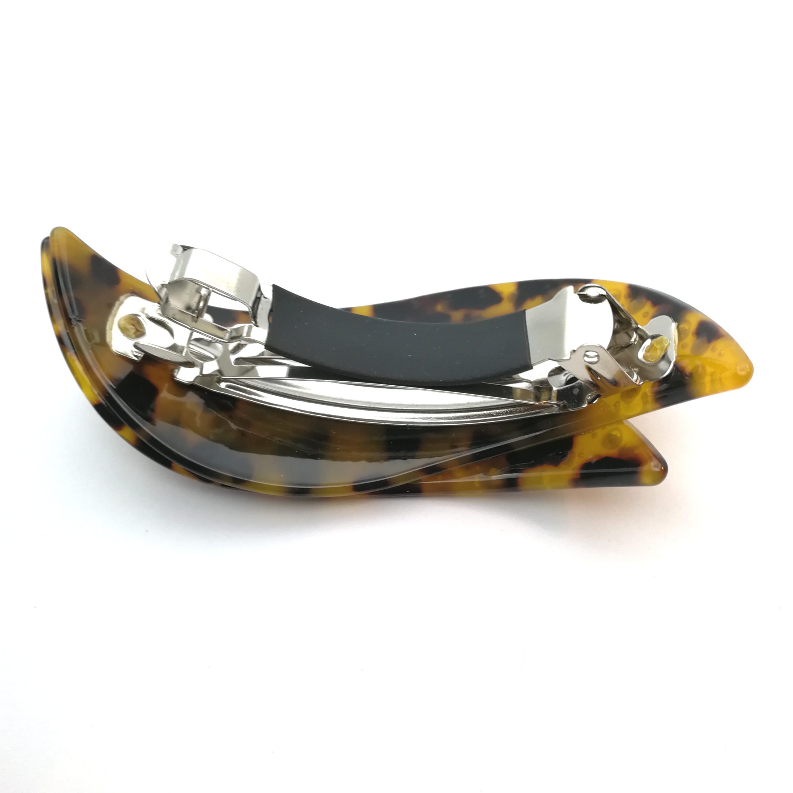 Spændet er formet som to blade der sidder forskudt og som er besatte med glitrende rhinsten. Spænderne changerer i farverne i et marmor lignende mønster. På selve spændelåsen er monteret et gummibånd som dels sikrer at spændet får et godt greb i håret og desuden at det er skånsom for håret.