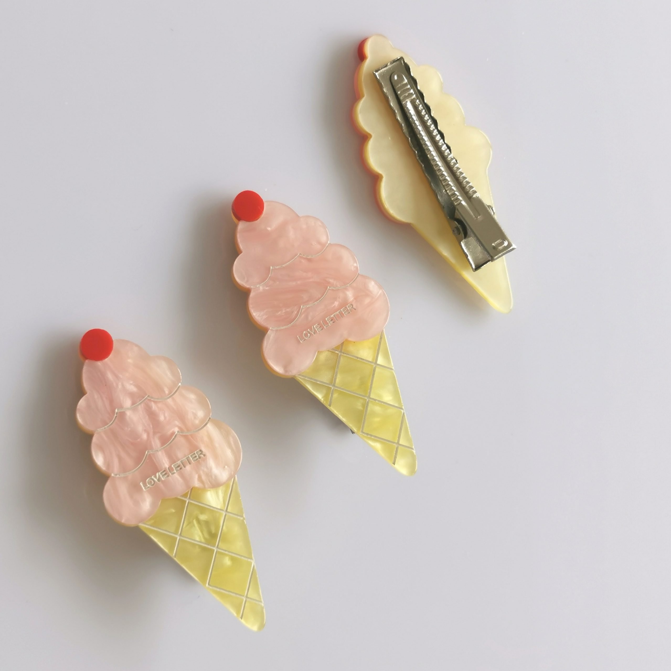 De sødeste isvaffel hårspænder, de er simpelthen ikke er til at stå for. Man får lige lyst til at tage en bid og det uanset om solen skinner eller ej. Hvem kan ikke lide is? Det kender vi ikke ret mange der ikke kan og disse fine isvaffel hårspænder i pastelfarver er så søde i håret på de mindre piger. Også en oplagt pigefødselsdagsgave eller en venindegave. Brug en enkel i håret eller sæt dem to ved siden af hinanden.