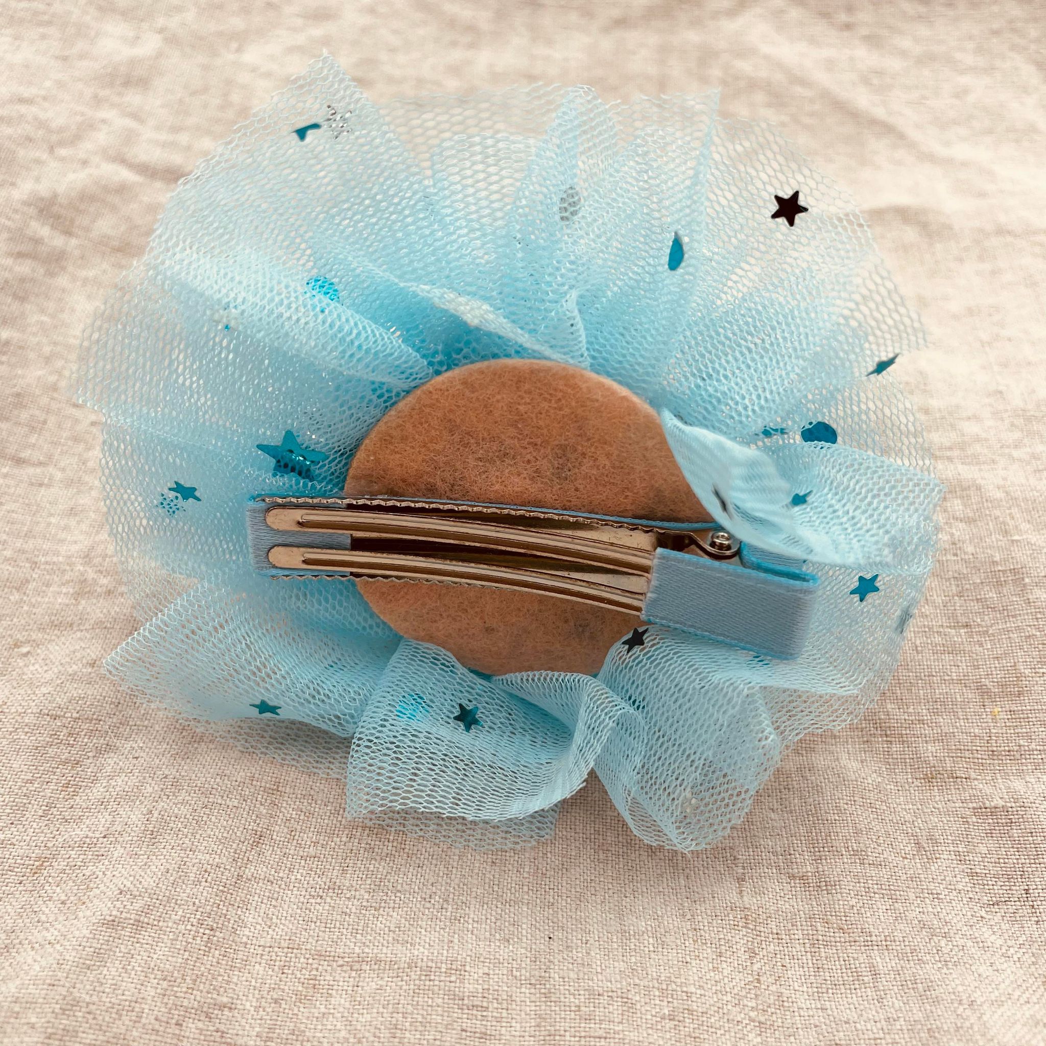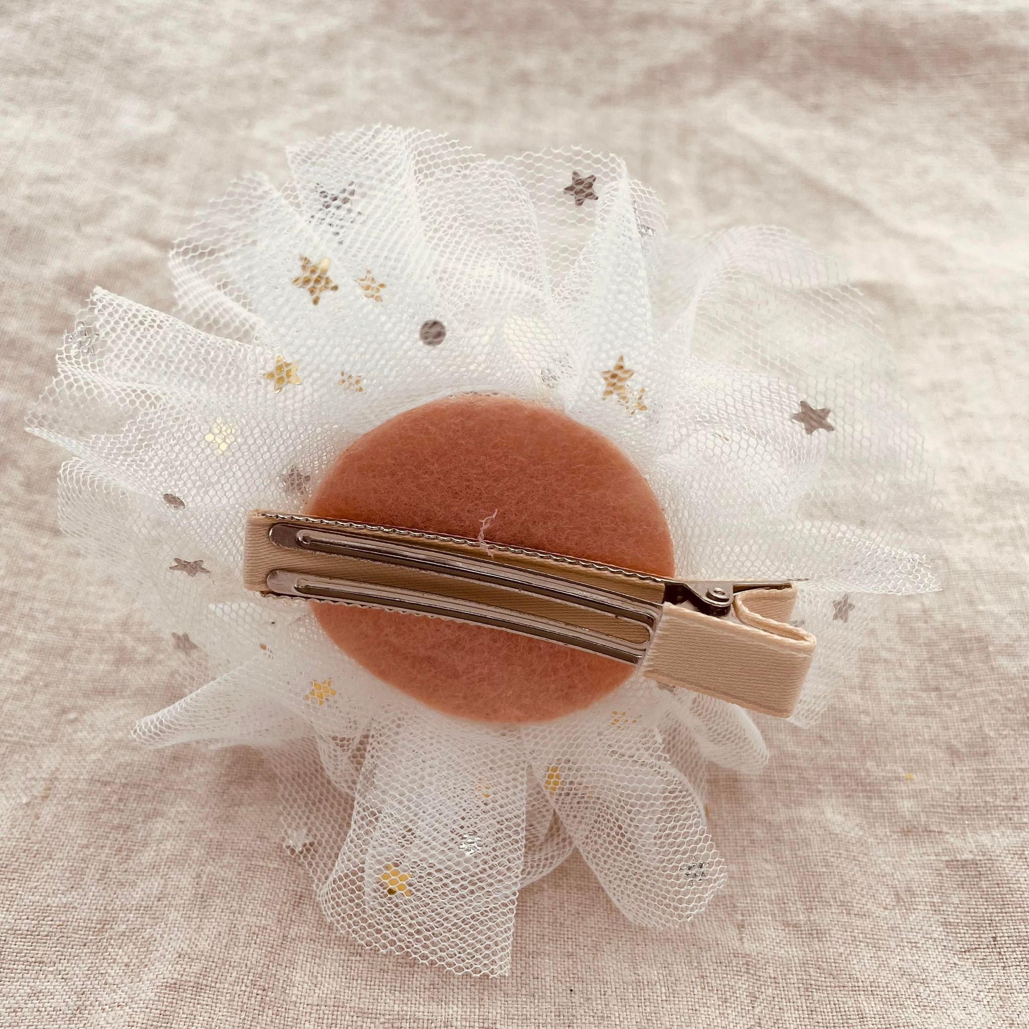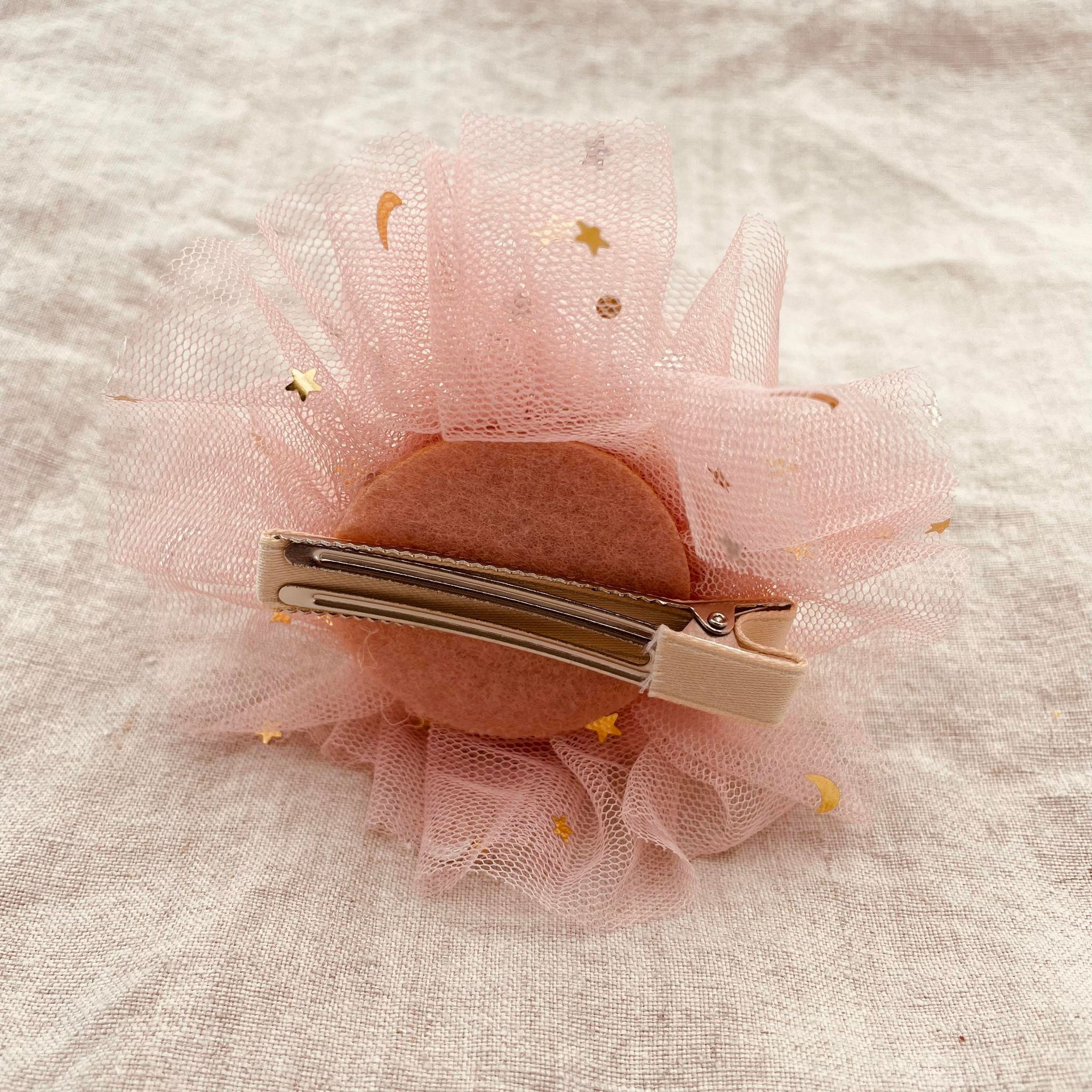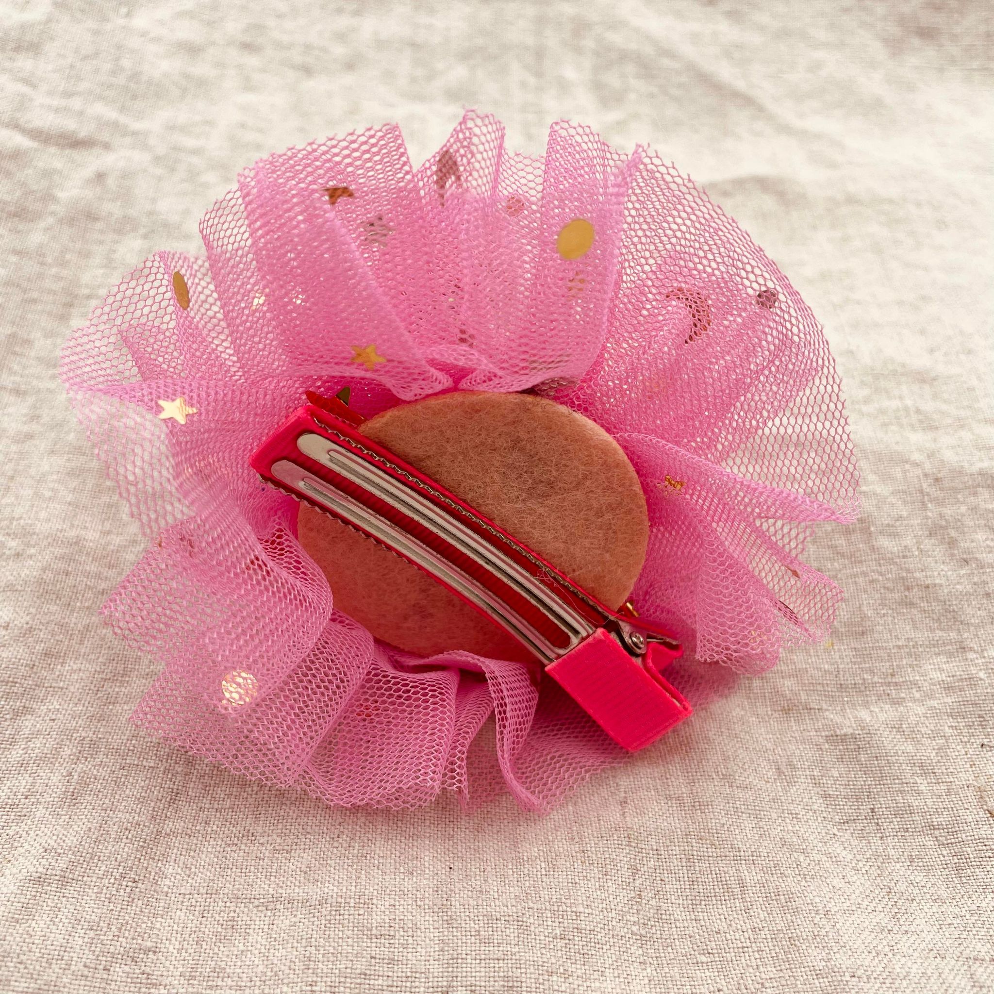 Skønne klovnehatte hårklemmer der emmer af fest, farver og eventyr. De har noget magisk og meget yndefuldt over sig og vil være mange små pigers drøm. Brug dem f.eks. i forbindelse med udklædning, til nytår, til fastelavn eller når der er brug for at sætte lidt kolerit på hverdagen. Hver klovnehat sidder monteret på en 6 cm lang hårklemme der matcher klovnehatten i farven. Med det fluffy tyl der sidder rundt om hatten har klovnehatten en diameter på ca. 9 cm. I tyllen er der bl.a. små fine metallic stjerner, og selve hatten er beklædt med små glimmer mosaikker (som ikke drysser). På toppen sidder der en fin, blød og fyldig pompom.
