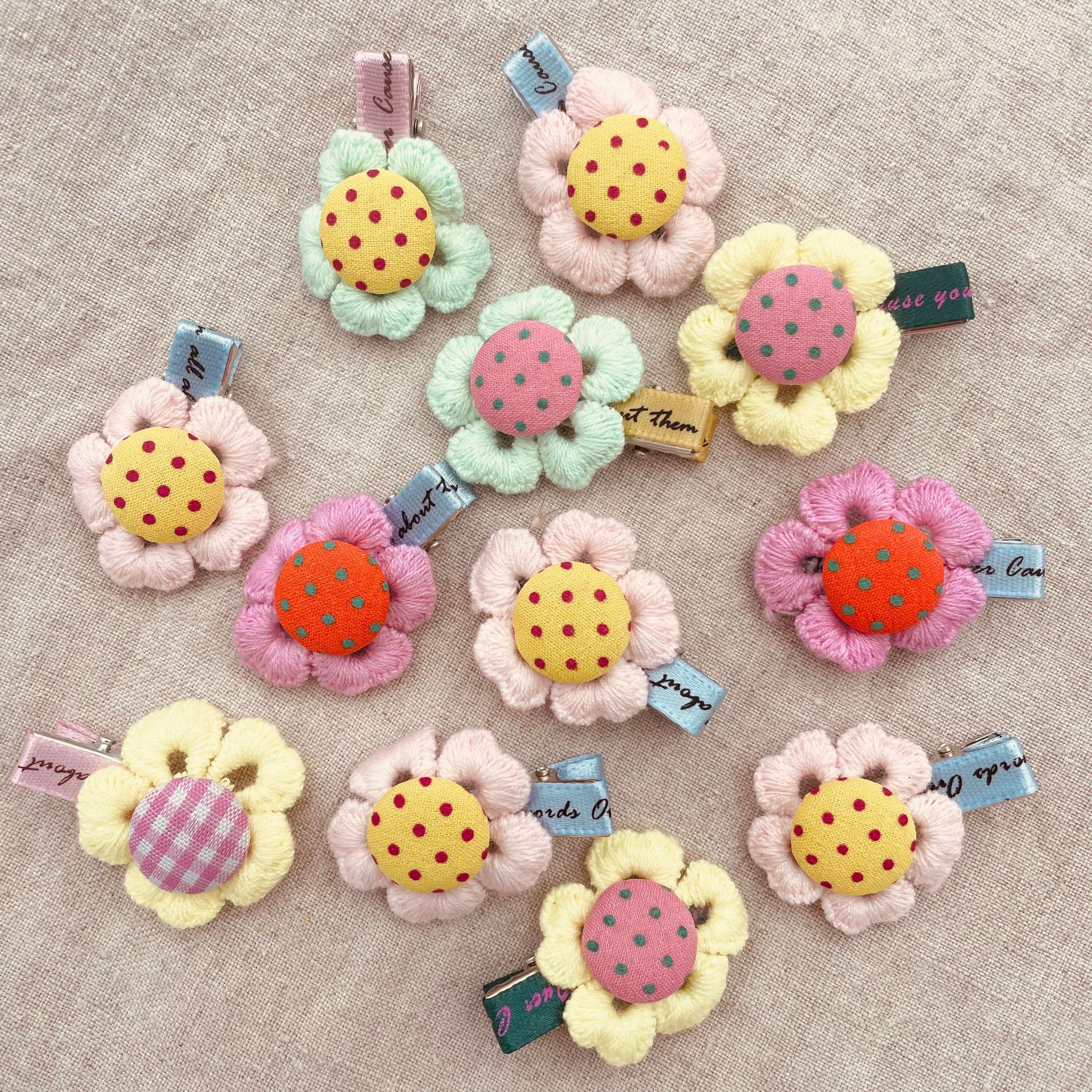 Petite blomsterhårklemmer til de mindste. De er super yndige og feminine i deres udtryk. De stof betrukne knapper er monterede på små fine beklædte hårklemme med skrift, og rundt om knappen er der en slags hæklet blomsterbort i en anden farve end selve knappen. Da der er tale om et håndlavet produkt, kan der forekomme små variationer fra hårklemme til hårklemme. Brug dem f.eks. til en lille tot pandehår som skal væk fra ansigtet.