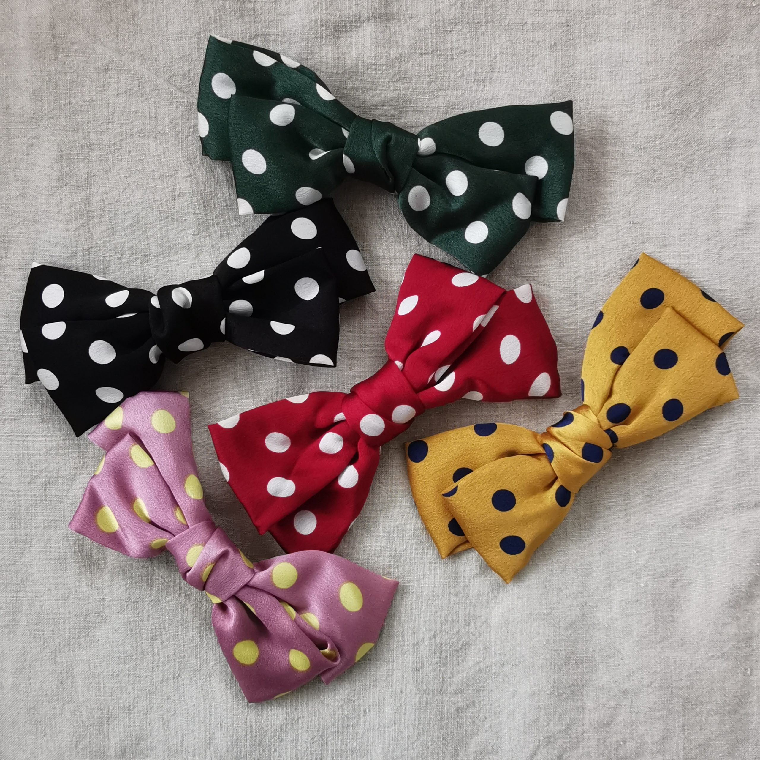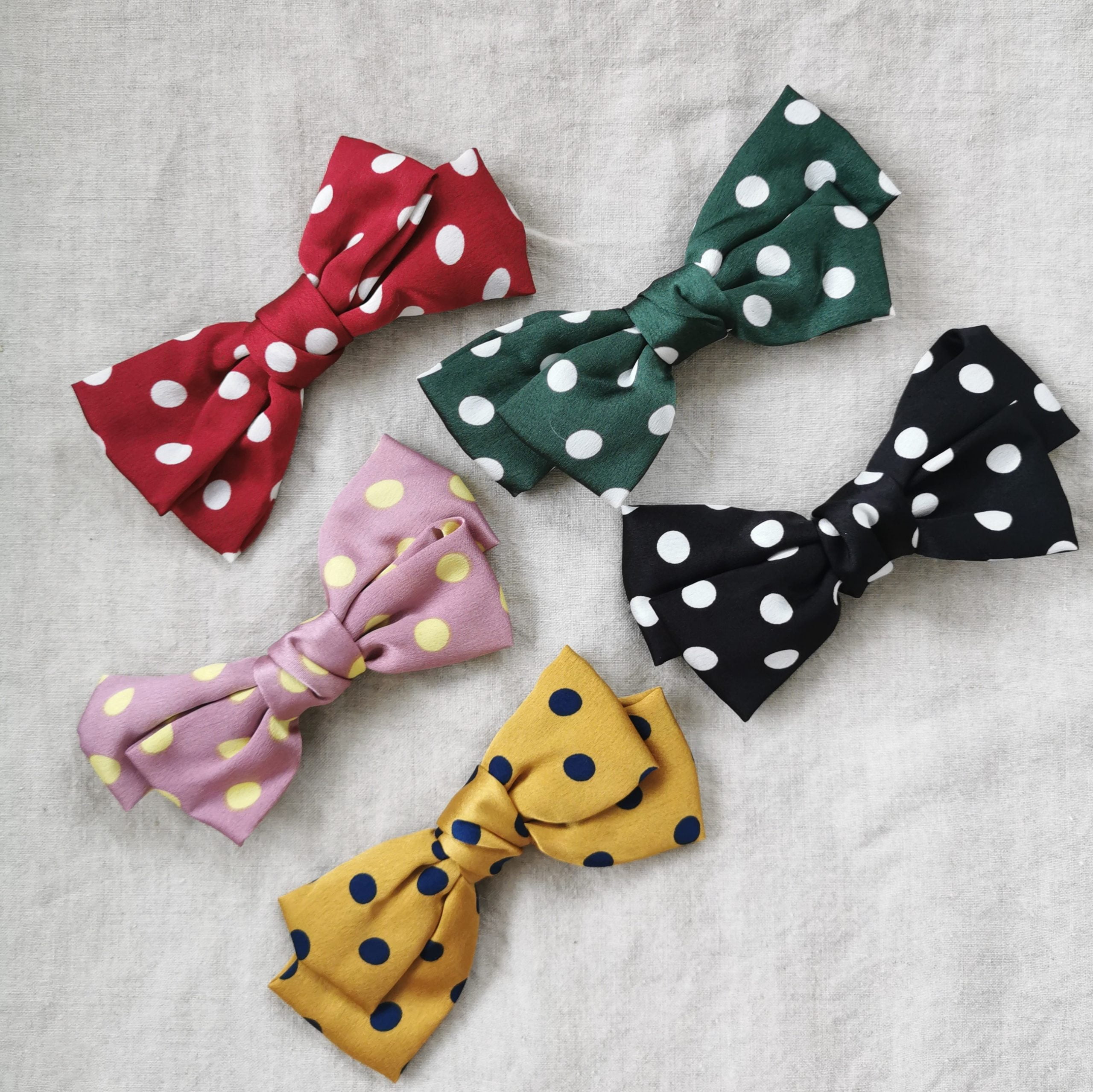 Vi har Polka sløjfe hårspænderne i fem farver kombinationer: rød med hvide prikker, grøn med hvide prikker, sort med hvide prikker, gammel rosa med gule prikker og gul med blå prikker.