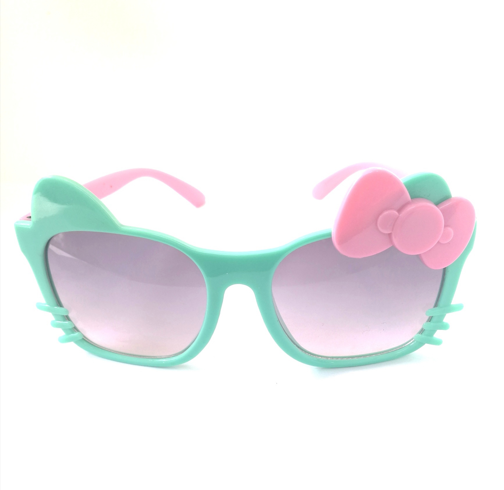 Sjove og festlige solbriller til børn. Mintgrøn brille med lyserød sløjfe.