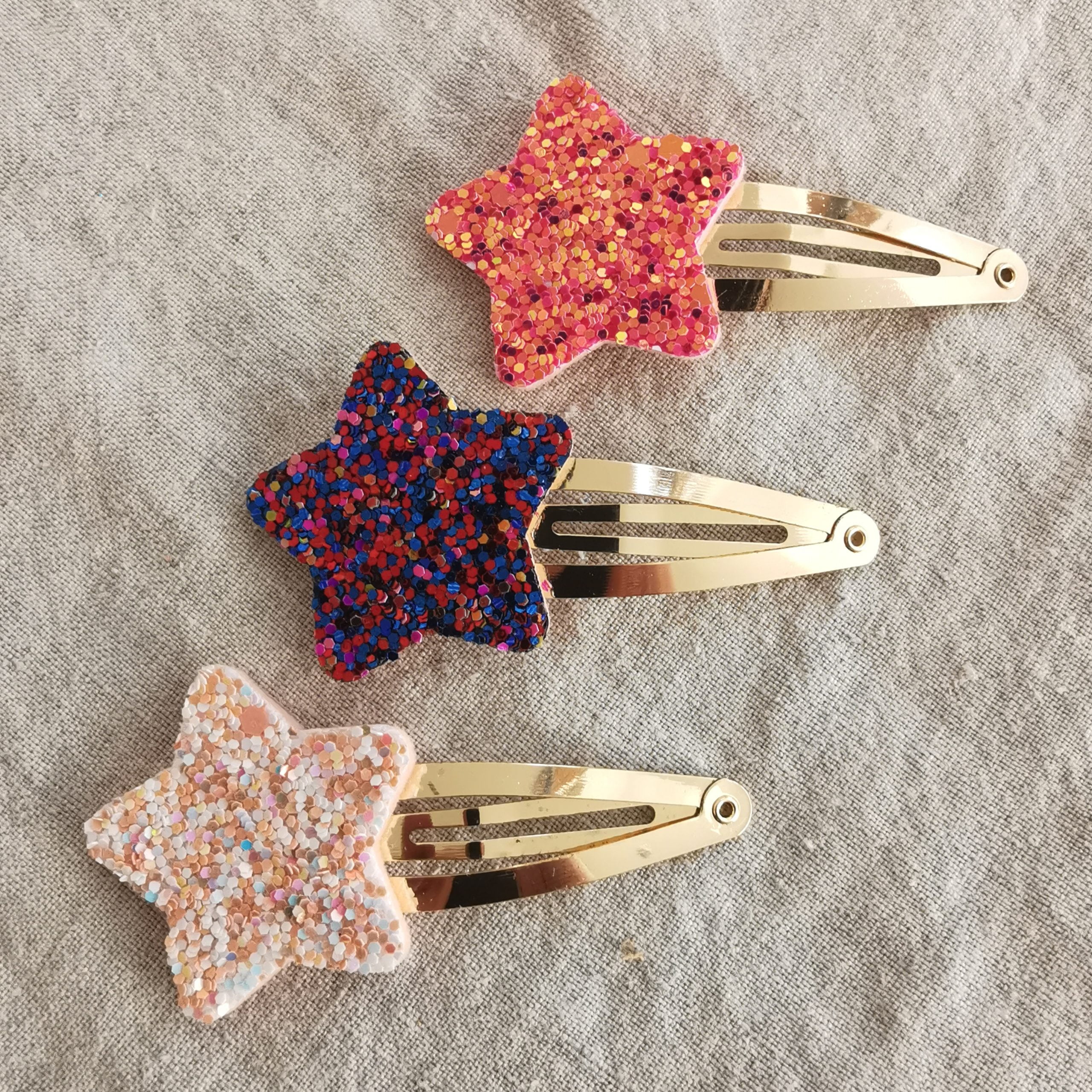 Søde stjerne hårspænder der glimter flot. Selve stjernen sidder på et klik-hårspænde, som er kendetegnet ved at det holder rigtig godt i håret. Stjernen er lavet i filt og beklædt med små metallicglitter. De er i en rigtig god kvalitet, så det er ikke sådan at det fine metallicglitter falder at eller drysser. Brug dem f.eks. til en lille tot pandehår som skal med tilbage eller i det opsatte hår.