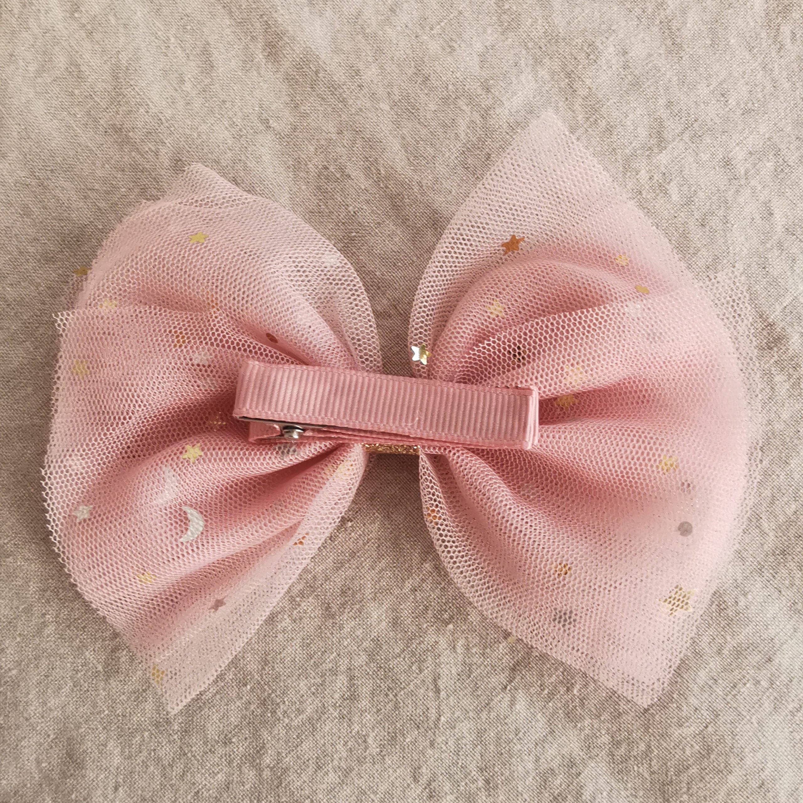 De sødeste tyl sløjfer til håret. Det er lavet i en blød tyl som er prydet med små stjerner, måner og prikker i guld og sølv. Det er masser at eventyr og prinsesse over disse fine tyl sløjfer og de er perfekte til små piger der kan lide at være pyntede eller som elsker at klæde sig ud. Selve sløjfen er monteret på en hårklemme der er betrukket med bånd der matcher tyllen. I midten af sløjfen er den samlet med et smalt guldbånd som holder de 6 lag tyl som sløjfen er bygget op om på plads. De er så fine at se på og vil være perfekte som tilbehør til f.eks. et strutskørt. De fine tyl sløjfer fås i fire farver: lys fersken, gammel rosa, gul og skygrå.